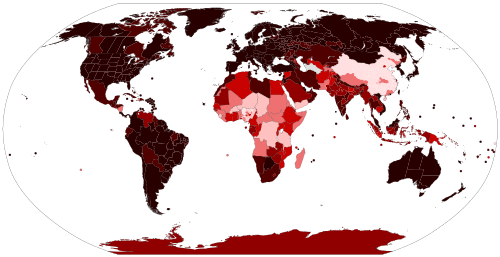 har 1 000 kishiga >1 holat har 10 000 kishiga 1–10 holat har 100 000 kishiga 1–10 holat har 1 million kishiga 1–10 holat har 10 million kishiga 1–10 holat har 100 million kishiga 1–10 holat | |