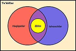 Bilish nazariyasi (gnoseologiya, epistemologiya) — falsafa boʻlimidan biri boʻlib, u bilish qonuniyatlari va imkoniyatlari, bilimning obyektiv reallikka munosabatini oʻrganadi, bilish jarayonining bosqichlari va shakllarini, bilishning ishonchliligi va haqqoniyligi shartlari va mezonlarini tadqiq qiladi. Bilish nazariyasi hozirgi zamon fanida qoʻllaniladigan usullar (tajriba, modellashtirish, analiz, sintez va hokazo)ni umumlashtirib, uning falsafiy-metodologik asosi sifatida namoyon boʻladi. Bilish jarayonida tajriba va amaliyotning katta ahamiyati bor. Bu yerda amaliyot (praktika) keng maʼnoda boʻlib, insonning jamiyatga taʼsiri, tabiat hodisalarini oʻzgartirishi, yangi narsalar, jamiyatning yashashi uchun zaruriy shart-sharoitlar yaratishi tushuniladi. Kishilarning tabiat qonunlari haqidagi bilimiga asoslangan amaliy faoliyatlari bilish taraqqiyotini, fan va texnika ravnaqini belgilaydi. Sezgi, tasavvur va tushunchalarimizning obyektivligini tekshirish bilish jarayonining eng muhim vazifasidir. Amaliyot — haqiqat mezoni. Bilimlarimizning haqiqiyligi amaliyot orqali tekshiriladi, tasdiqlanadi. Bilish jarayoni jonli mushohada (hissiy bilish)dan abstrakt (mavhum) tafakkurga, undan esa amaliyotga oʻtish bilan xarakterlanadi. Jonli mushohada, deganda biz sezgi, idrok, tasavvur kabilarni, yaʼni sezgi aʼzolari orqali tashqi olamning miyaga taʼsiri natijasida paydo boʻladigan inʼiko shakllarini tushunamiz. Sezgi dunyoni inʼiko etishning boshlangʻich shaklidir. Demak, sezgi — obyektiv dunyoning subyektiv intiqosi. U sezgi aʼzolari orqali borliq hodisalari, buyumlarning xususiyat va sifatlarini bir-biri bilan bogʻlanmagan holda aks ettiradi. Idrok qilish hissiy bilishning murakkabroq shakli boʻlib, u sezgi aʼzolariga bevosita taʼsir koʻrsatuvchi buyumni yaxlit holda aks ettiradi. Inson miyasining umumlashtiruvchi faoliyatiga asoslangan bu aks ettirish jarayoniga kishining oldingi tajribalari, abstrakt tafakkurning faoliyati va boshqa ham kelib qoʻshiladi. Shularga asoslangan idrok qilish narsalarning zarurroq, chuqurroq tomonlarini aqlan (fikran) ajratib olishga va bilishga imkon beradi. Miya inson ilgari idrok qilgan narsani oʻz xotirasida saqlab qolish va uni qayta tiklash qobiliyatiga ega. Sezgi aʼzolariga taʼsir koʻrsatmayotgan buyumning ana shunday qayta tiklangan qiyofasi tasavvur deb ataladi. Inson hissiy bilish bosqichida toʻxtab qolmaydi. U mazkur bosqich doirasidan chiqishi, buyumlarning umumiy, zaruriy va muhim xususiyatlari hamda munosabatlarini, ularning bevosita hissiy mushohada qilib boʻlmaydigan qonuniy aloqalarini bilib olishi mumkin. Bunga abstrakt tafakkur — bilishning mantiqiy bosqichi orqali erishiladi. Bilish jarayonining sifat jihatdan yangi, oliy bosqichi — mavhum tafakkur jamiyatdan va tildan tashqarida boʻlmaydi. U amaliyotning, tarixiy taraqqiyotning mahsuli. Tafakkur voqelikning umumlashtirilgan, yaʼni bilvosita aksidir. Tafakkur va til bir-biri bilan chambarchas bogʻlangan. Til boʻlmas ekan — umumlashtirish jarayoni ham boʻlmaydi. Hissiy bilish singari mavhum tafakkur ham muayyan shakllarda roʻy beradi. Bu shakllar tushuncha, muhokama va aqliy xulosalardir. Tushuncha narsa va hodisalarning umumiy va muhim tomonlarini aks ettiradi. Masalan, „odam“ tushunchasi hamma insonlarga xos eng asosiy belgilarni oʻzida mujassam ifoda qiladi. Muhokamada buyumlarda muayyan xususiyatlar mavjudligi taʼkidlanadi yoki inkor qilinadi. Tilda muhokamalar ran orqali ifodalanadi. Bir yoki bir necha muhokama vositasi bilan yangi muhokama olish imkonini beradigan tafakkur shakli aqliy xulosa, deb ataladi.