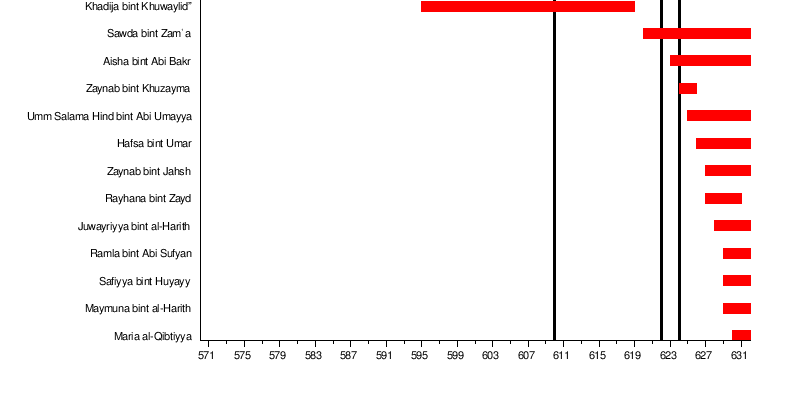 Grafikdagi vertikal chiziqlar xronologik tartibda paygʻambarlikning boshlanishi, hijrat va Badr jangini koʻrsatadi .