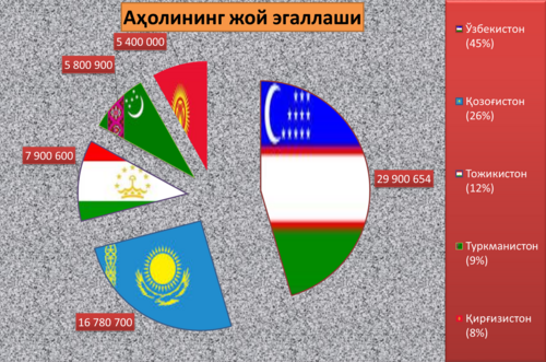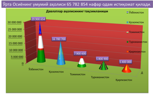 • Oʻrta Osiyoning 5 mamlakatining umumiy aholisi soni 2012-yilga koʻra - 95.700.000 kishini tashkil qildi.