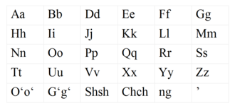 | A a | B b | Ch ch | D d | E e | F f | G g | Gʻ gʻ | H h | I i | ||