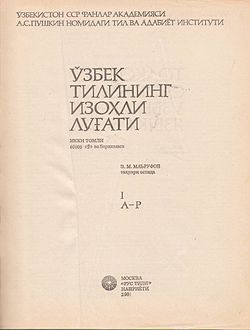 ![]() „Oʻzbek tilining izohli lugʻati“ I jildining titul beti | |