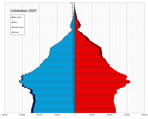 BMT maʼlumotlariga koʻra Oʻzbekis ton aholisining yosh tarkibi dunyo aholisi yosh tarkibiga taqqoslansa, bolalar salmogʻining ancha yuqoriligi kuzatiladi.