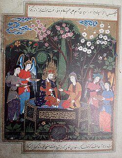Farishtalar qurshovi ichida Adan bogʻida turgan Odamato va Momohavo (Eron islomiy rassomchiligiga oid tasvir)