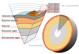 Yer poʻsti deb ataluvchi qatlam oʻrtacha 30 km qalinlikka ega boʻlib, uning ostidagi Yer mantiyasi 2900 km chuqurlikkacha boradi. Undan pastda – 5500 km li chuqurlikkacha suyuq tashqi yadro joylashgan boʻlib, markazda diametri 1500 km chamasidagi qattiq subʼyadro yotadi. Yerdan tashqarida tashqi geosferalar – suv sferasi (gidrosfera) va havo sferasi (atmosfera) joylashgan.