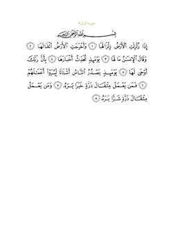 Qurʼon nusxalaridan biridagi Zalzala surasi sarlavhasi. Yuqorida oʻngdan: 1. Oyati 8, 2. Markazda qizil rangda sura tartib raqami 99, qora rangda - Zalzala surasi va Madaniy, qizil rangda nozil boʻlgan tartibi - 93, 3. Rukuʼsi soni - 1; Pastda oʻngdan: 1. Sura:Madaniy, 2. Tilovat tartibi:99, 3. Nozil boʻlish tartibi:93, 4. Rukuʼsi:1, 5. Oyati:8, 6. Porasi (Juzi):30 deb koʻrsatilgan.